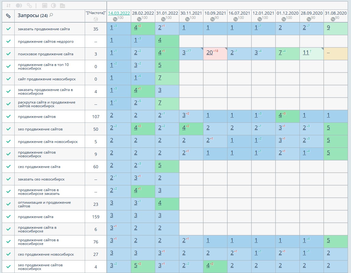 Таблица с позициями сайта с начала работ по SEO продвижению