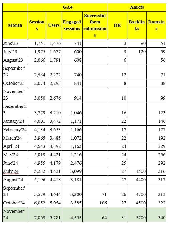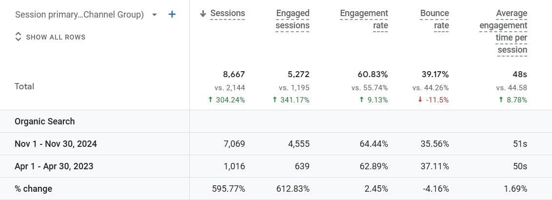 За время SEO-продвижения органический трафик вырос на 6053 визита, или на 595,77%, а количество Engagement sessions выросло с 639 до 4555 визитов, или на 612,83%.