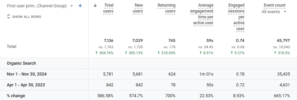За время SEO-продвижения количество уникальных пользователей выросло на 4939 визитов, количество ключевых событий увеличилось на 30804.