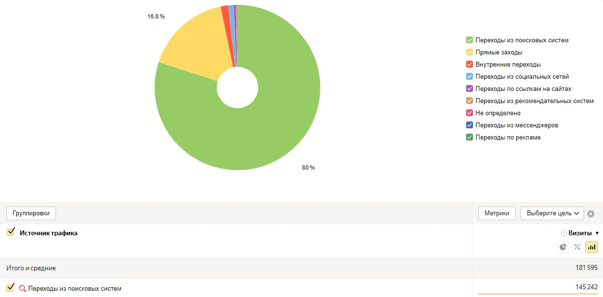 Переходы из поисковых систем за последний год составили 80%, что значит 145 242 визита