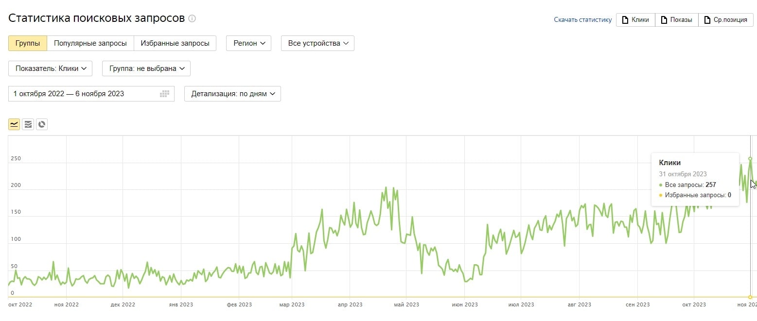 Такая постатейная проработка контента позволила увеличить количество переходов с 30 кликов в сутки до 250 кликов в сутки