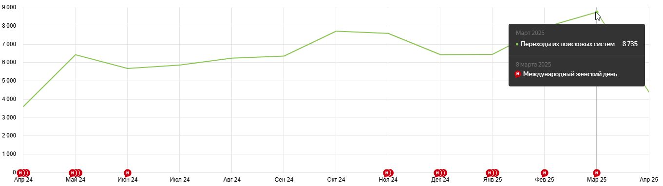 С 2021 года по настоящее время наблюдаем стабильное количество входящего трафика по SEO, увелившееся из 100 до 8000 переходов из поисковых систем в месяц.