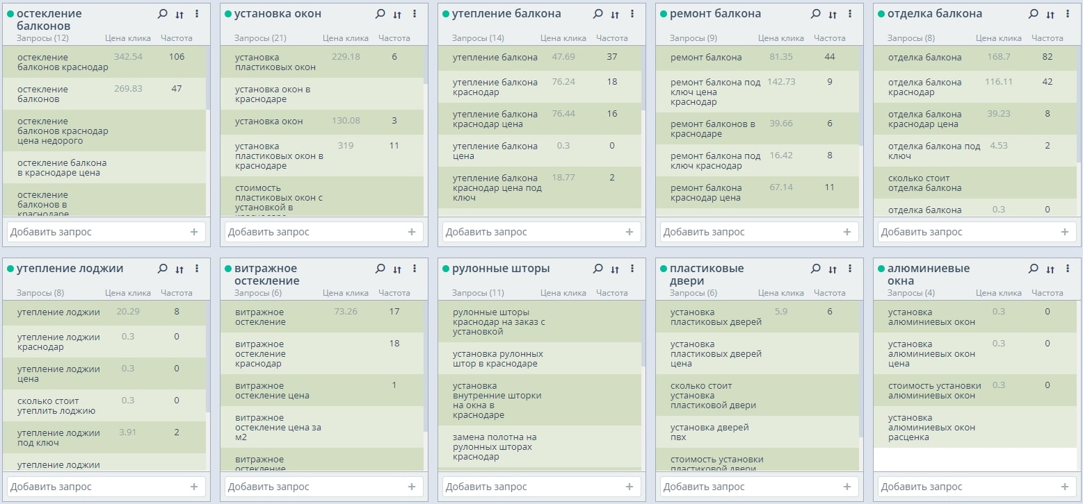 - Сбор высокочастотных и среднечастотных запросов по теме услуг ремонта и отделки балконов, установки окон.