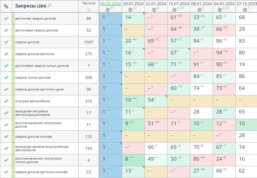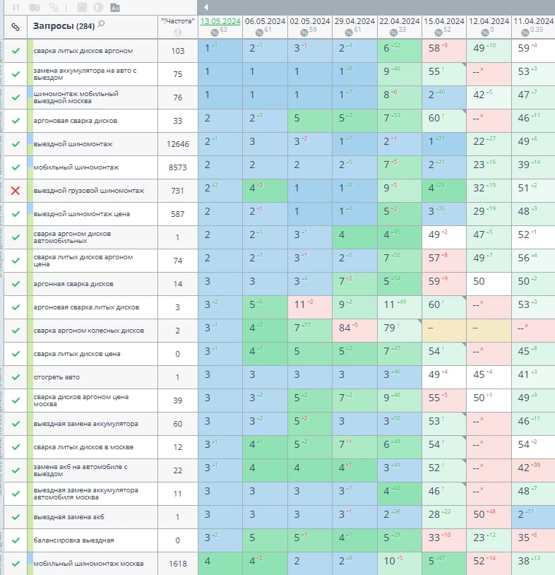 - Сбор запросов по темам: сварка трещин в литых дисках, запуск авто (прикурка), выездная сезонная смена шин, доставка топлива, устранение проколов порезов любой сложности, профессиональное снятие секретных болтов, восстановление геометрии диска, замена АКБ, сварка дисков, заправка кондиционеров, отогрев легковых авто, отогрев грузовых автомобилей, грузовой шиномонтаж. А так же были собраны запросы связанные с выездной заменой шин по районам Москвы.